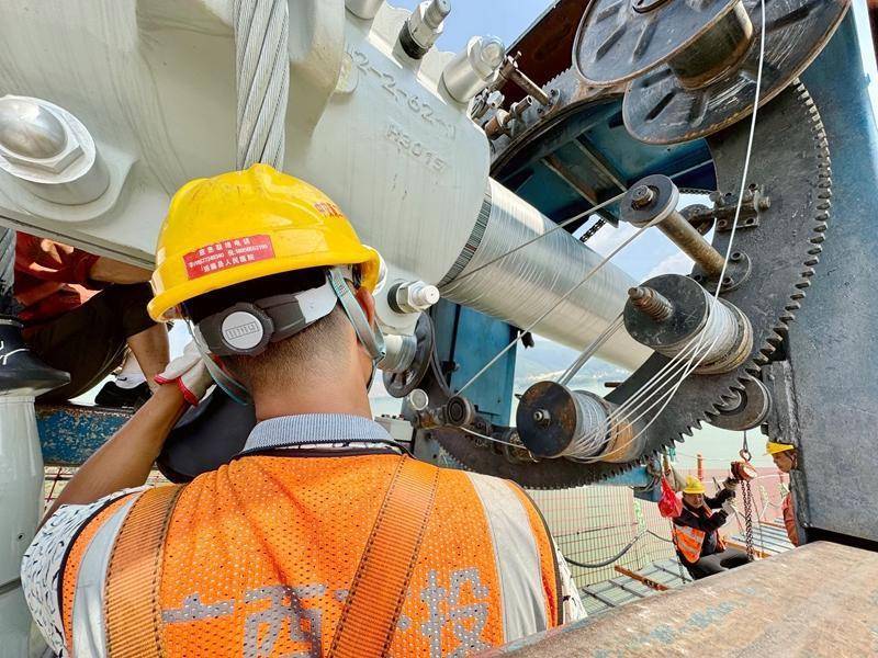 缠丝顺序为先中跨后边跨,由高处向低处进行,尽可能避免施工过程中雨水浸入主缆。作业工序包括主缆表面清洁、起始段缠丝、正常段缠丝和末端缠丝。为保障施工质量和进度,苍容浔江大桥攻坚突破党员突击队坚守施工一线,党员干部充分发挥先锋模范作用,带头值班值守,主动担当作为,全力推动大桥主缆缠丝作业顺利进行。